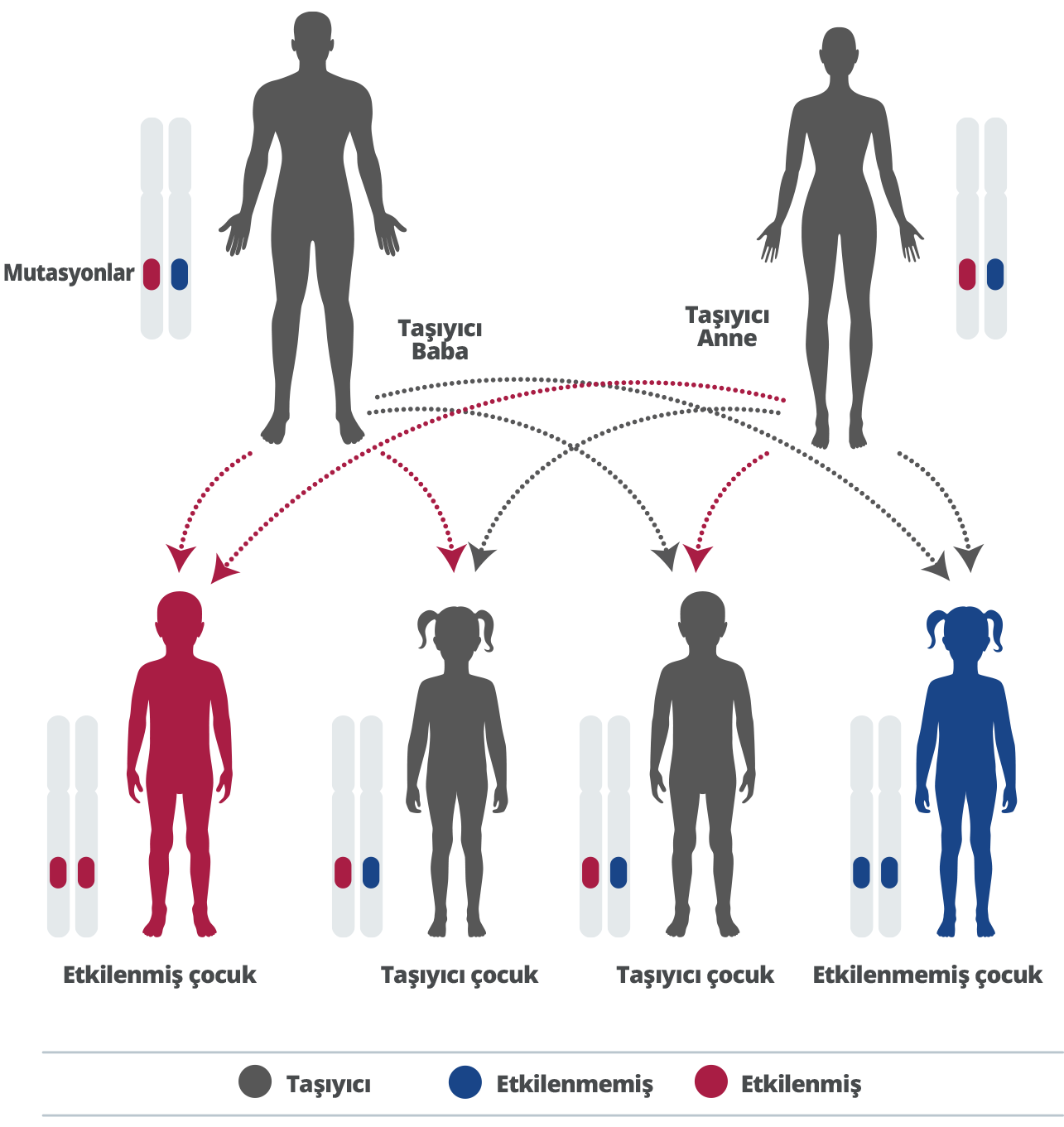 Genler ebeveynlerimizden geçer. Her ebeveynden her genin bir kopyasını alırız. Miras aldığımız bazı genler “çekinik”tir, yani gelişimimiz üzerinde herhangi bir etkisi olması için o genin her iki kopyasının da kalıtsal olması gerekir.7
