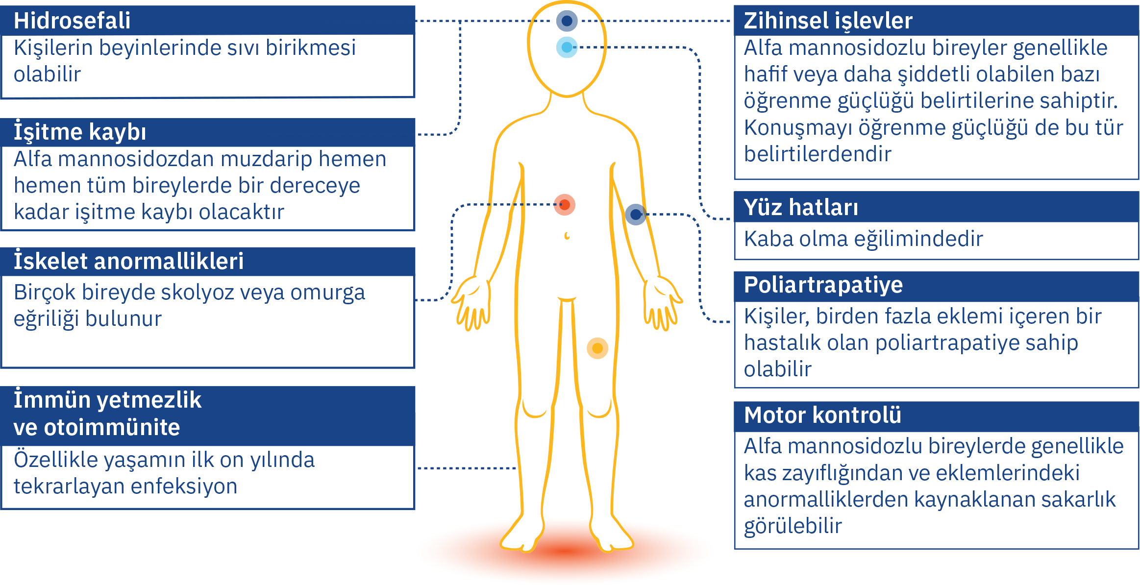 Alfa Mannosidozun semptomları, diğer ilgili bozukluklar gibi çok değişken olabilir.1